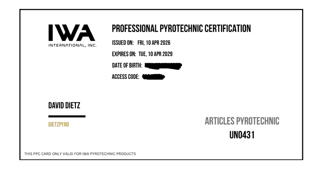 • IWA Certified: We are a Professional Pyrotechnic Certified manufacturer (IWA-PPC).
